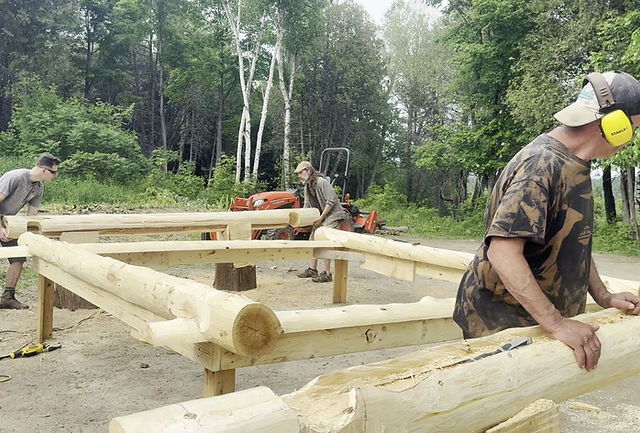 Here we see Marie and Daniel using a chainsaw and Solan using a chisel to remove the excess material so that the log fits perfectly onto the next one​​